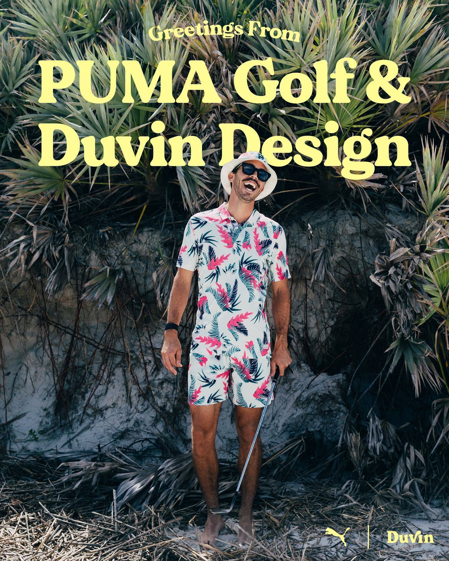 今年夏天與世界知名球星-瑞奇法勒( Rickie Fowler) 及海灘潮流品牌 Duvin 共同攜手合作,打造完美融合加州陽光風格與佛羅里達渡假氛圍的限定聯名款。服裝上出現的粉紅花朵與深淺漸層的棕櫚葉,搭配招牌豹眼穿梭其中,創造熱帶球場及渡假沙灘完美相互應的前衛視覺。