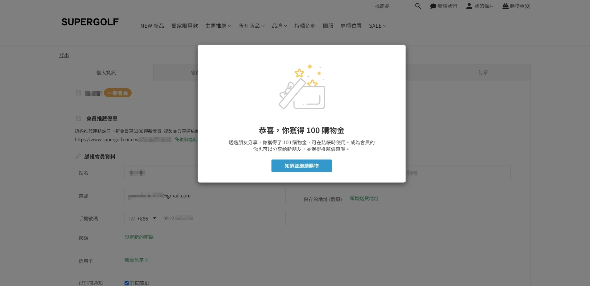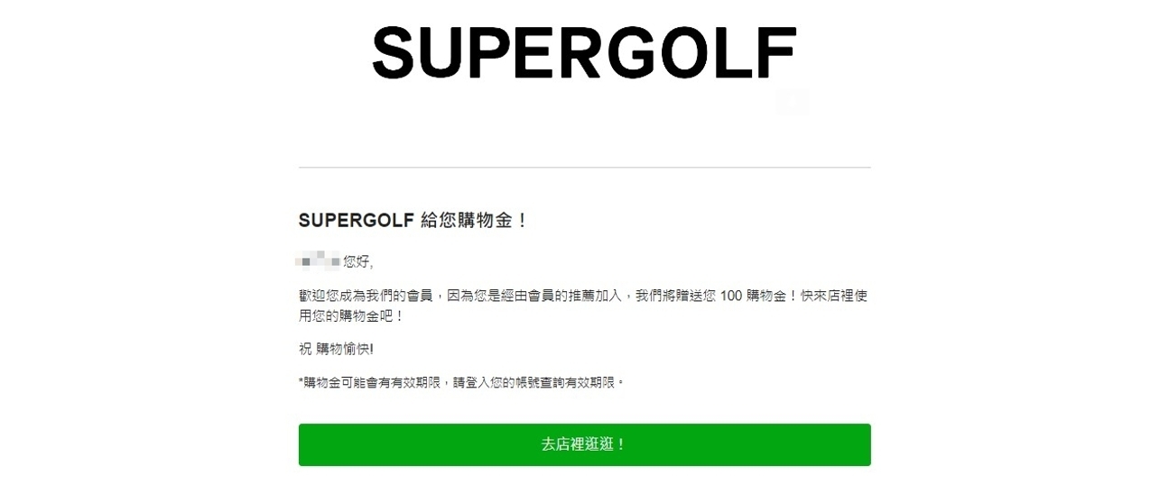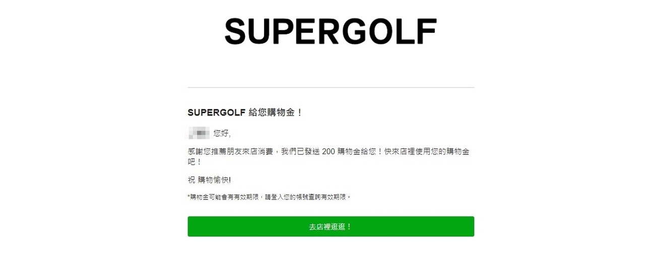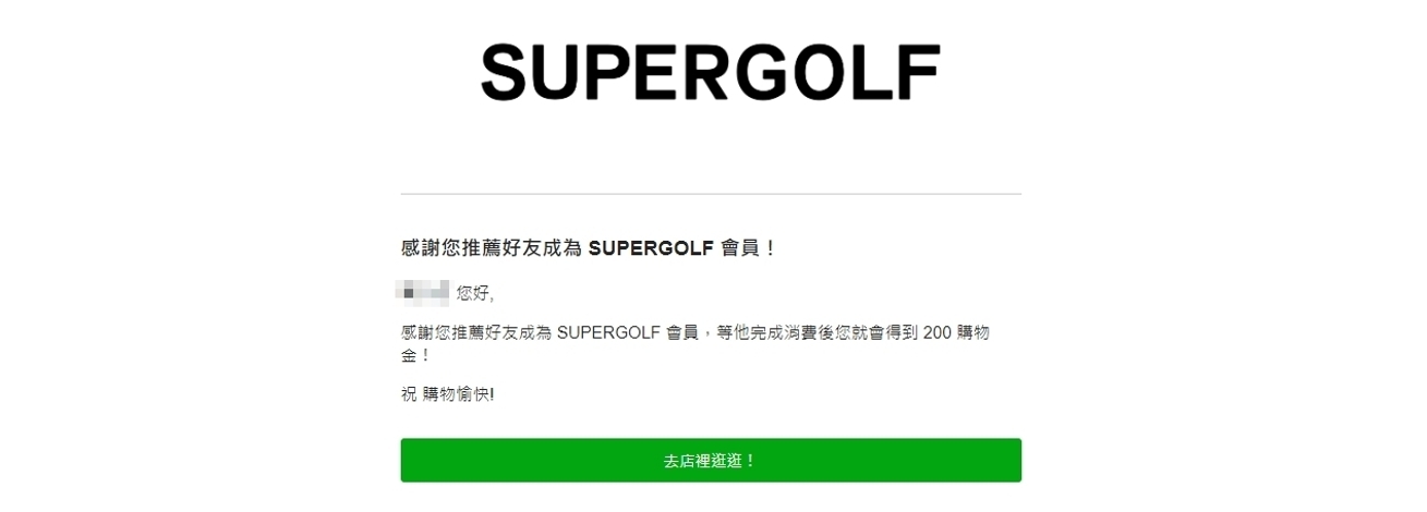 將連結分享給朋友,待朋友成功註冊且第一筆訂單狀態更改為「已完成」,該會員(推薦人)即可獲得購物金。而系統在購物金成功發送給推薦人後,會寄送信件通知,如下圖所示。